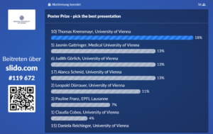The first afternoon session included six excellent short oral contributions selected from the submitted abstracts. Talks were given by Somnath Mukherjee (University of Vienna, Austria), Khadija Daoudi (Pasteur Institute of Morocco), Roland Hellinger (Medical University of Vienna, Austria), Bernhard Jandl (University of Vienna, Austria), Stavroula Melina Sakellakou (University of Vienna, Austria) and Julia Kriegesmann (University of Vienna, Austria).
