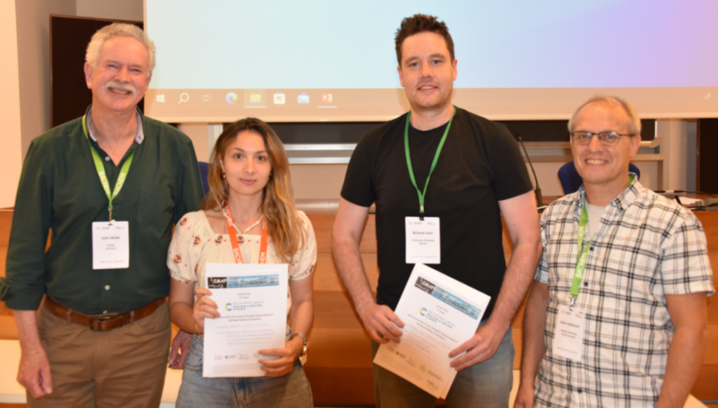 The poster prizes were presented by Prof. John Wade, representing the Protein & Peptide Science Group of the Royal Society of Chemistry (sponsors of the poster competition) and Dr. Edwin Veldhuizen (chair of the judging panel). The winners of the Poster Competition were: