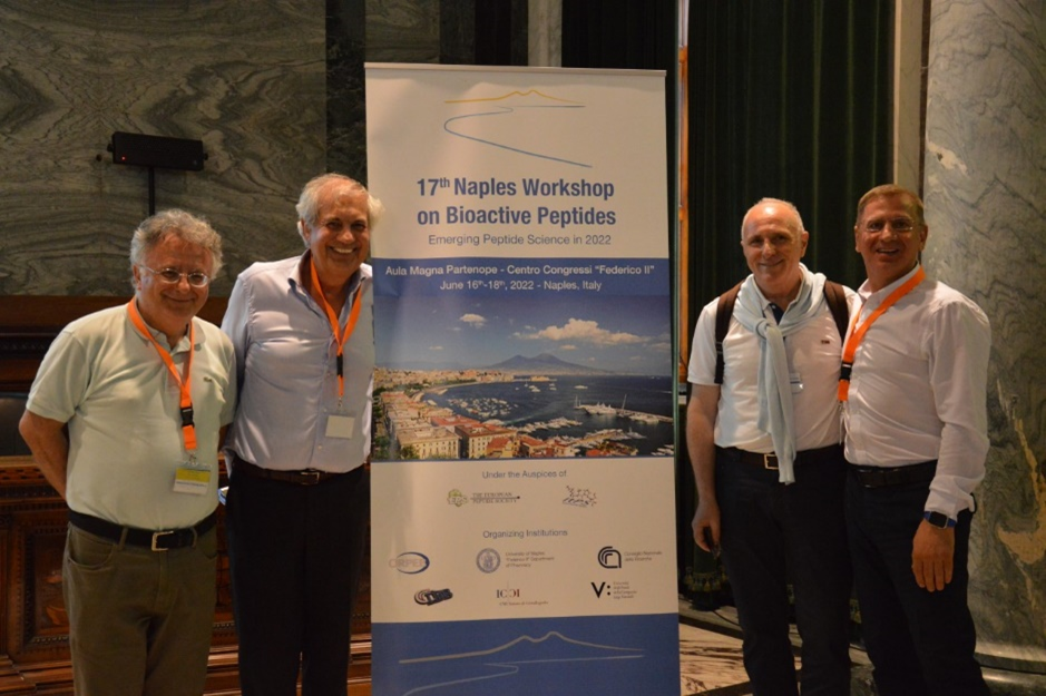 The 17th Naples Workshop on Bioactive Peptides has been held at the Congress Center of the University of Naples ‘Federico II’ on June 16-18, 2022. The event has had a high attendance of over 200 peptide scientists of different countries from all over the world. The workshop was held under the auspices of the European Peptide Society (EPS) and of the Italian Peptide Society (ItPS) and has been organized by a joint effort of the Interuniversity Research Center on Bioactive Peptides (CIRPEB) and by Department of Pharmacy at University of Naples ‘Federico II’, by the Institute of Biostructures and Bioimages, and the Institute of Crystallography of the Italian C.N.R. The theme of the workshop “Emerging Peptide Science in 2022” was covered by several plenary lectures, oral presentations, and poster presentations.