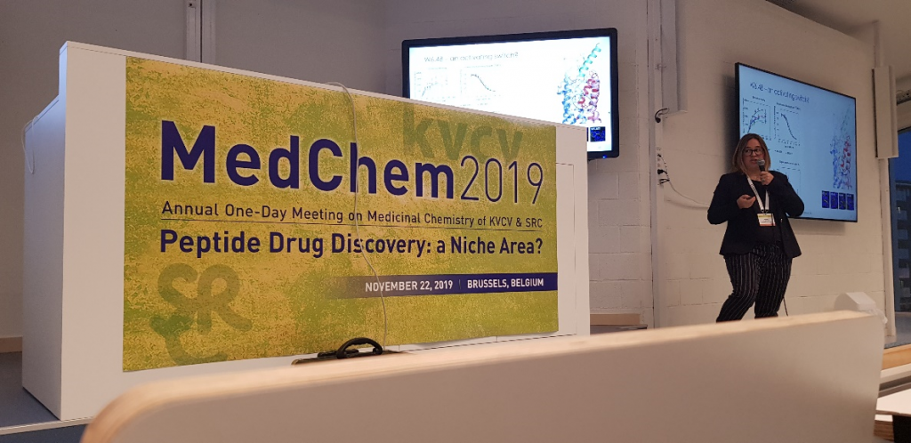 The Medicinal Chemistry Divisions of the two Belgian Chemical Societies, the Koninklijke Vlaamse Chemische Vereniging (KVCV) and the Société Royale de Chimie (SRC), organise every year an international one-day symposium with the aim to update participants on selected areas of pharmaceutical research by specialists in their respective field. MedChem 2019 was held on Friday November 22, 2019, in Brussels. This year, the symposium delved into the developments in the therapeutic use of peptides. The programme of the day included six invited lectures and three oral communications selected from submitted abstracts. A diverse set of lectures was assembled comprising topics such as peptide macrocycles (Prof. Eric Marsault, University of Sherbrooke, Québec, Canada), the use of peptidic shuttles to address CNS therapies (Dr. Meritxell Teixido, Institute for Research in Biomedicine, Barcelona, Spain), new anticancer strategies by targeting the lactate dehydrogenase tetramerization process (Mr. Léopold Thabault, UCLouvain, Brussels, Belgium), targeting receptor complexes by means of peptides (Prof. Kristian Stromgaard, University of Copenhagen, Copenhagen, Denmark), peptide-based approaches to immuno-oncology (Prof. Christian Becker, University of Vienna, Vienna, Austria), the synthesis of mirror-image monobodies for cancer therapies (Dr. Timothy Reichart, Ecole Polytechnique de Lausanne, Lausanne, Switzerland), self-assembling peptides for controlled-drug release (Prof. Charlotte Martin, Vrije Universiteit Brussel, Brussels, Belgium), the process of transferring natural peptides to a laboratory setting (Prof. Fernando Albericio, University of Kwazulu Natal, Durban, South Africa) and structural biology of G protein-coupled receptors (Dr. Annette Kaiser, University of Leipzig, Leipzig, Germany). The meeting was furthermore supported by the European Federation for Medicinal Chemistry (EFMC), the European Peptide Society (EPS) and Vrije Universiteit Brussel (VUB). Whereas further financial support was provided by sponsors such as BCI Pharma, Janssen Pharmaceutica, UCB and ChemPubSoc Europe, the exhibitors Biotage, BioSPX, Iris Biotech, Merck, Polypeptide Group and Waters could actively interact with the attendees over the scheduled coffee breaks and lunch period. With approximately one third of all attendees (124 in total) coming from abroad, the topic ‘therapeutic peptides’ did attract the needed attention beyond the Belgian borders (15 different nationalities were represented at the meeting). Interestingly, a very balanced audience of students, academics and industrials guaranteed lively Q&A sessions after each presentation. Altogether, the meeting was a big success and the answer to the question ‘Peptide Drug Discovery: a Niche Area?’ was answered even before the first lecture started!!